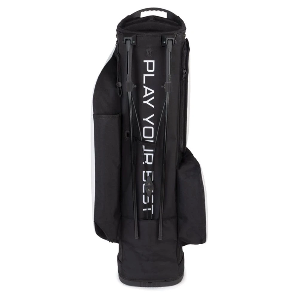 The bag inspired by the Ping Tour Staff bag having the same fabric giving it an easy clean but super durable vinyl. The Hoofer Tour Golf Stand Bag is well organized and affords generous cart like baggage space because this is rare in a stand bag. A new back puck allows the dual padded straps to convert easily to a single. And the large apparel pocket has a full-length zipper for easier access. A magnetic quick-access pocket and two zippered, expandable water-bottle pockets are among 9 pockets altogether. With a roomy 5-way top. A wicked looking bag and harks back to the yesteryear hoofers of the past with a great looking modern twist