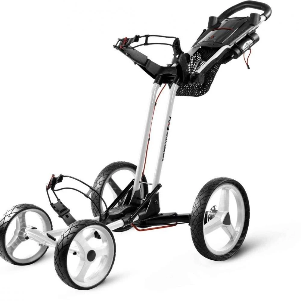 SunMountain Pathfinder PX4 white trolley continues to innovate the push cart markets with the introduction of the new PX4 wheel high traction and stability cart This may look new and wacky – but this is the real deal, its simplicity and ease of use and storage versatility really is the key. It offers convenience, stability, and durability.